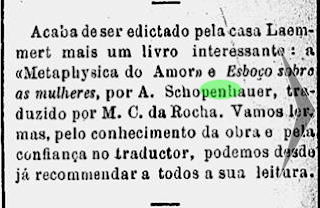 Eis o primeiro Schopenhauer em tradução brasileira - Pensamentos e fragmentos: Metaphisica do amor. Esboço sobre as mulheres. Tradução de Manuel Coelho da Rocha. Laemmert, 1887. 72 p.
